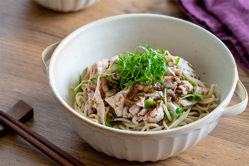 - 5皿に蕎麦を盛り、上に④の和えた豚しゃぶをのせる。